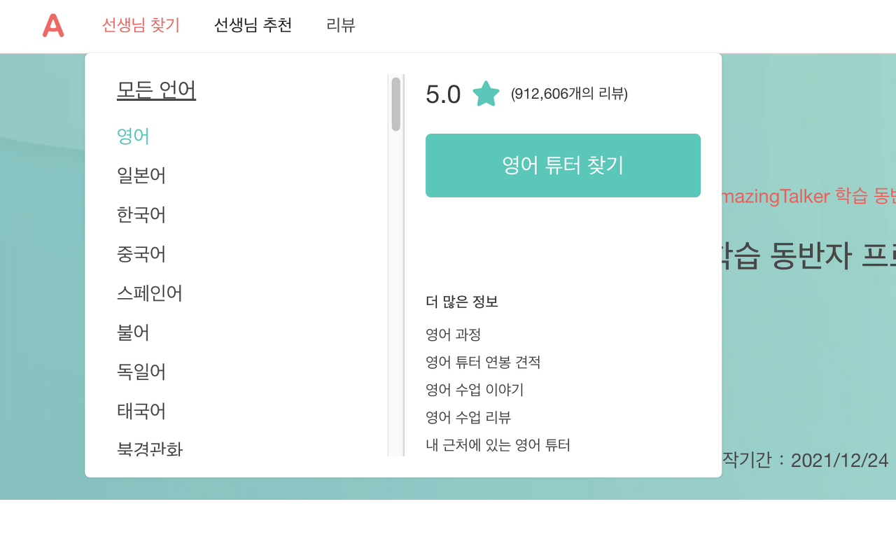 간단하게 회원가입을 완료하면 위와 같이 왼쪽 상단의 '선생님 찾기' 버튼을 클릭하면 먼저 언어를 선택할 수 있습니다.