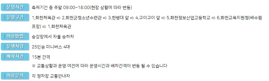 축제장에서 먼 곳에 주차하셨거나 주변숙소에서 출발하는 경우에는 주말기간 동안 15분간격으로 셔틀버스가 자주 운행되니 필요하신 분들은 이용하시면 되겠습니다.