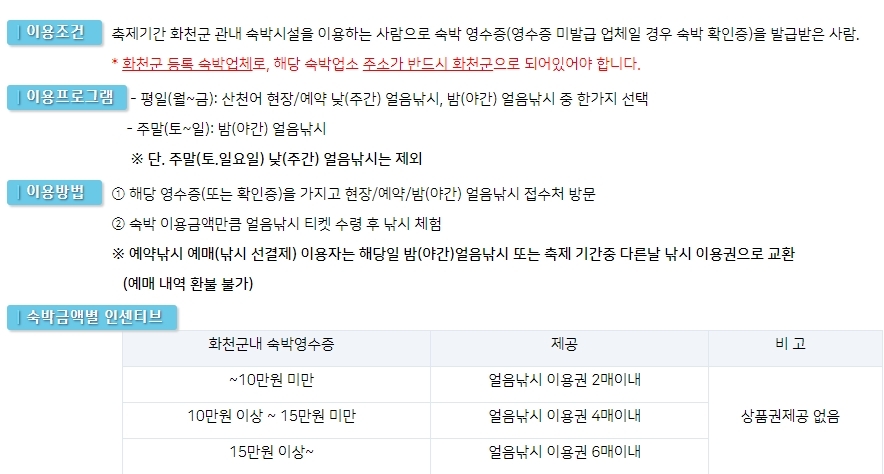 화천군에서는 축제 기간동안 화천군 내 숙박업소에서 숙박한 관광객을 대상으로 산천어 축제 무료 체험권을 증정합니다.