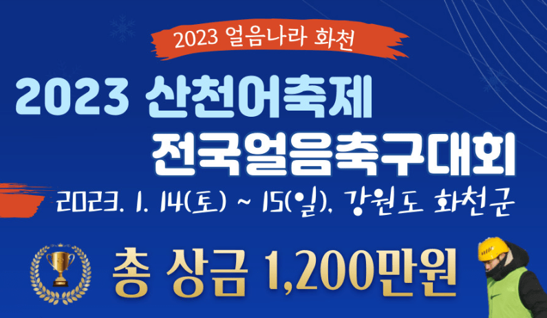 2023 전국얼음축구대회는 2023. 1. 14(토) ~ 1. 15(일)까지 이틀 동안 얼음축구장에서 개최됩니다. 총상금 1,200만원으로 1위 5백만원, 2위 2백만원, 4강 두 팀 백오십만원, 8강 네 팀 오십만원의 상금이 있습니다.