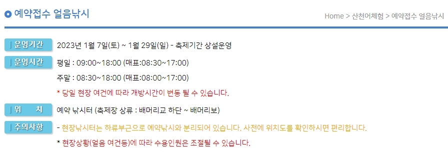 얼음낚시는 현장접수/ 예약접수/ 외국인 / 산천어 밤낚시로 구분되기 때문에 위치확인이 필수사항입니다.