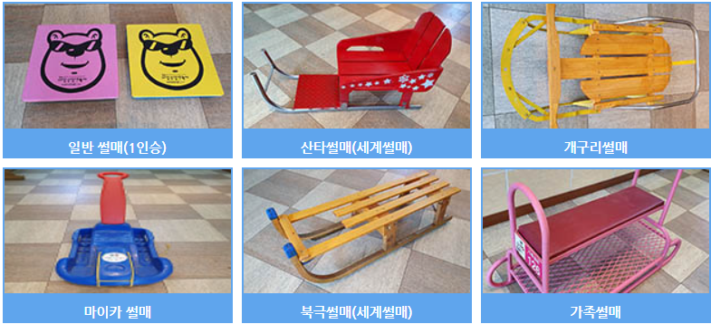 얼음썰매, 산타썰매, 개구리썰매, 마이카썰매, 북극썰매, 가족썰매 등 나라별, 용도별, 인원별로 구분된 다양한 썰매를 즐길 수 있습니다.