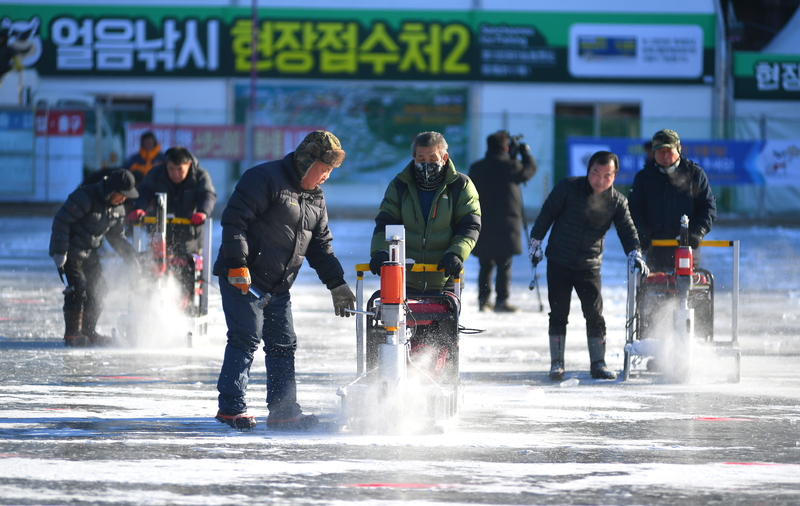산천어 얼음낚시란, 하천의 물이 30cm 이상 꽁꽁 얼게 되면 얼음에 구멍을 뚫고 산천어를 낚는 것입니다.