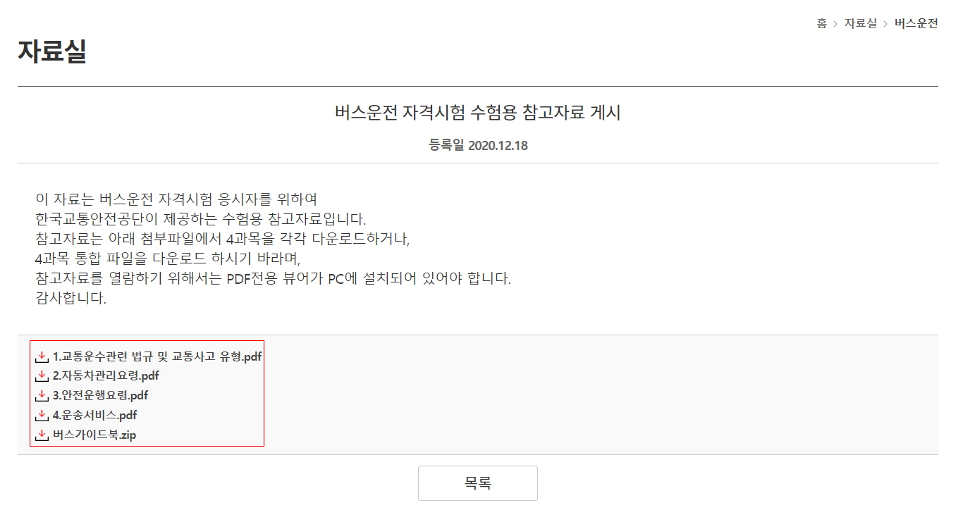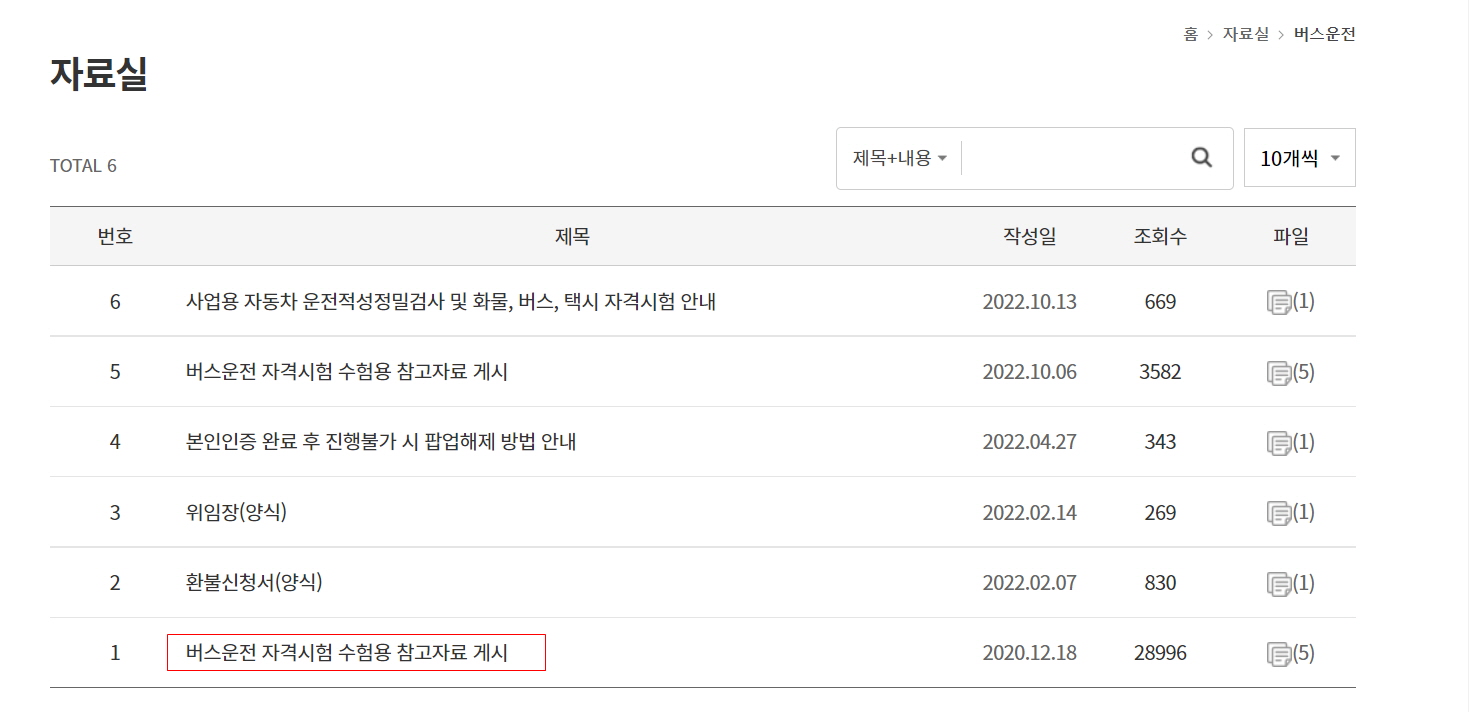 아래 링크를 클릭하여 국가자격시험 도로자격 홈페이지로 들어간 후, 버스운전 > 자료실을 클릭합니다.