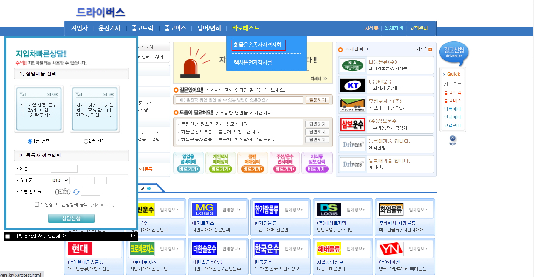 홈페이지에 접속하여 상단 메뉴 중 바로테스트 > 화물운송자격시험을 선택합니다.
