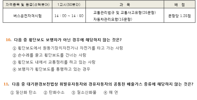 그런데 버스운전자격시험 기출문제를 찾아야 하는데 왜 화물운송자격시험 기출문제를 푸는가 궁금하실 꺼라고 생각됩니다. 그 이유는 두 자격시험의 과목 중 3과목이 겹치기 때문입니다.