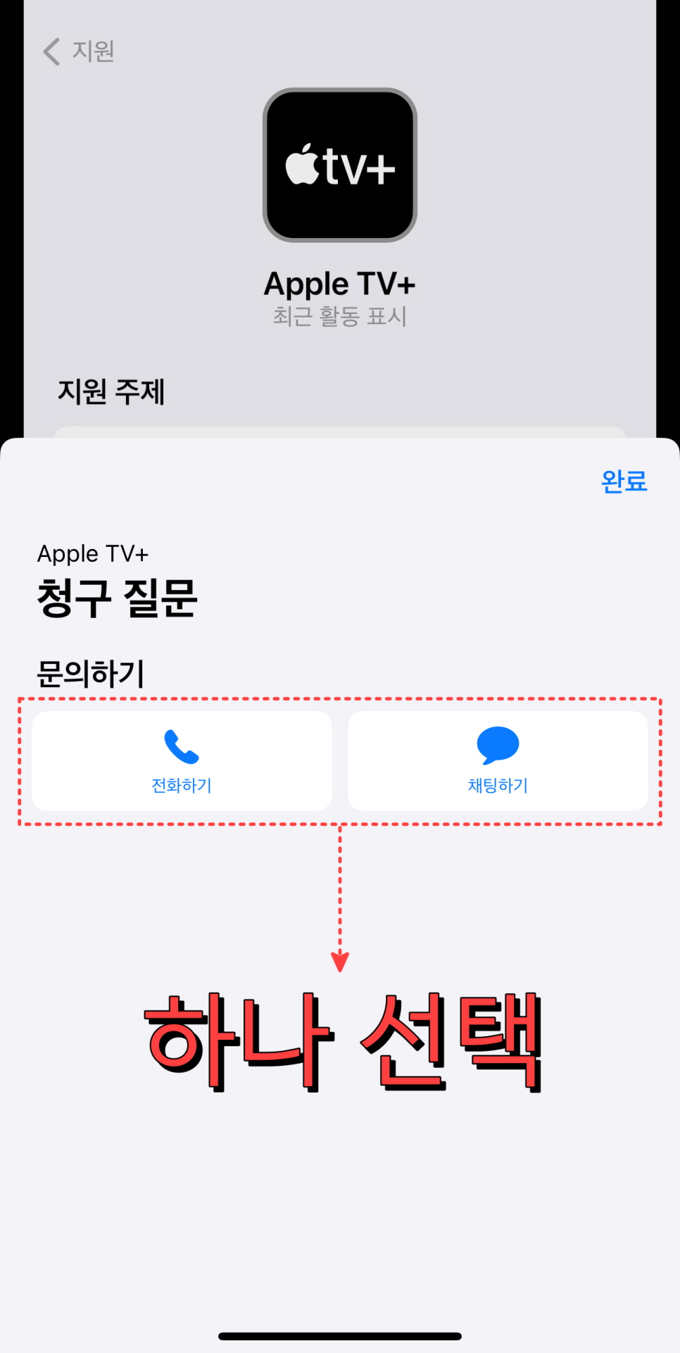나의 서비스에서 Apple TV+를 선택하신 후 [청구 질문] - [문의하기]에서 '전화하기' 및 '채팅하기' 방식으로 상담을 진행할 수 있습니다. 추천드리는 방식은 채팅하기 방식인데, 대화 이력이 남아 있어 어떤 내용으로 질문과 답변을 남겼는지 확인할 수 있기 때문입니다.
