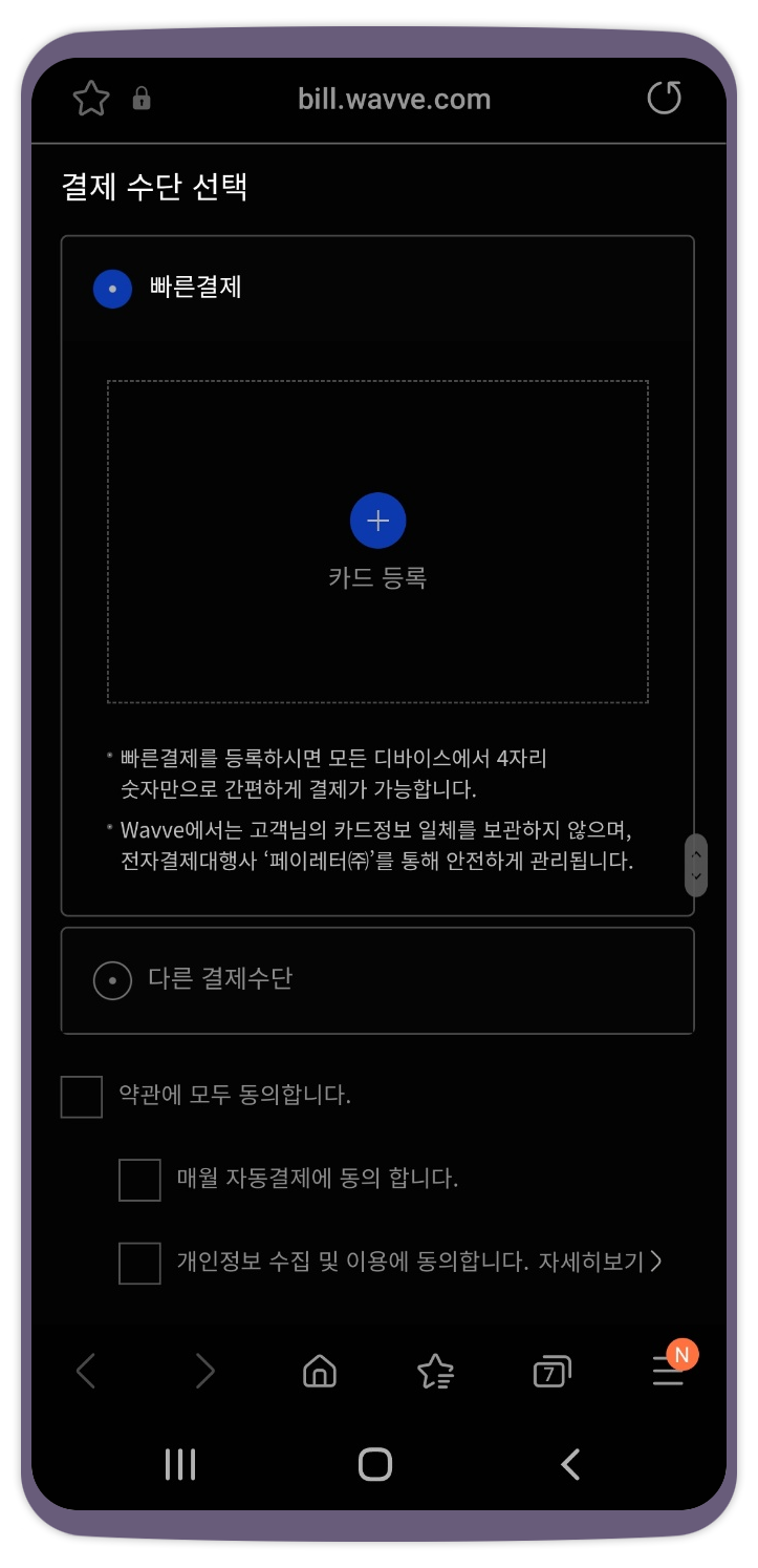 요금제를 선택하신 후에는 팝업 화면이 나오게 되는데 결제수단을 선택하시고, 약관에 동의하신 후 다음을 눌러주시면 됩니다.