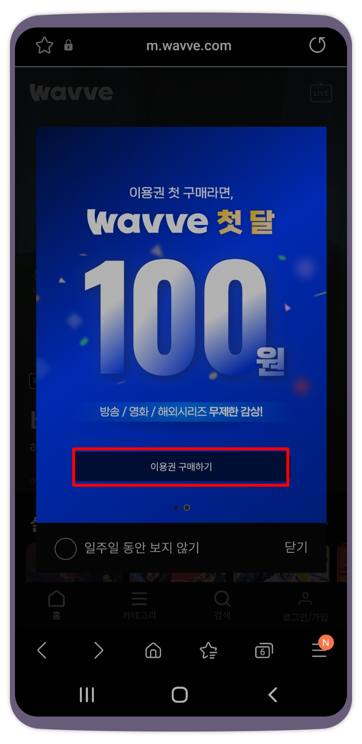 접근권한과 알림에 대한 설정이 완료되면, 위와 같이 '첫 달 100원'에 관한 이벤트 페이지를 보실 수 있습니다.