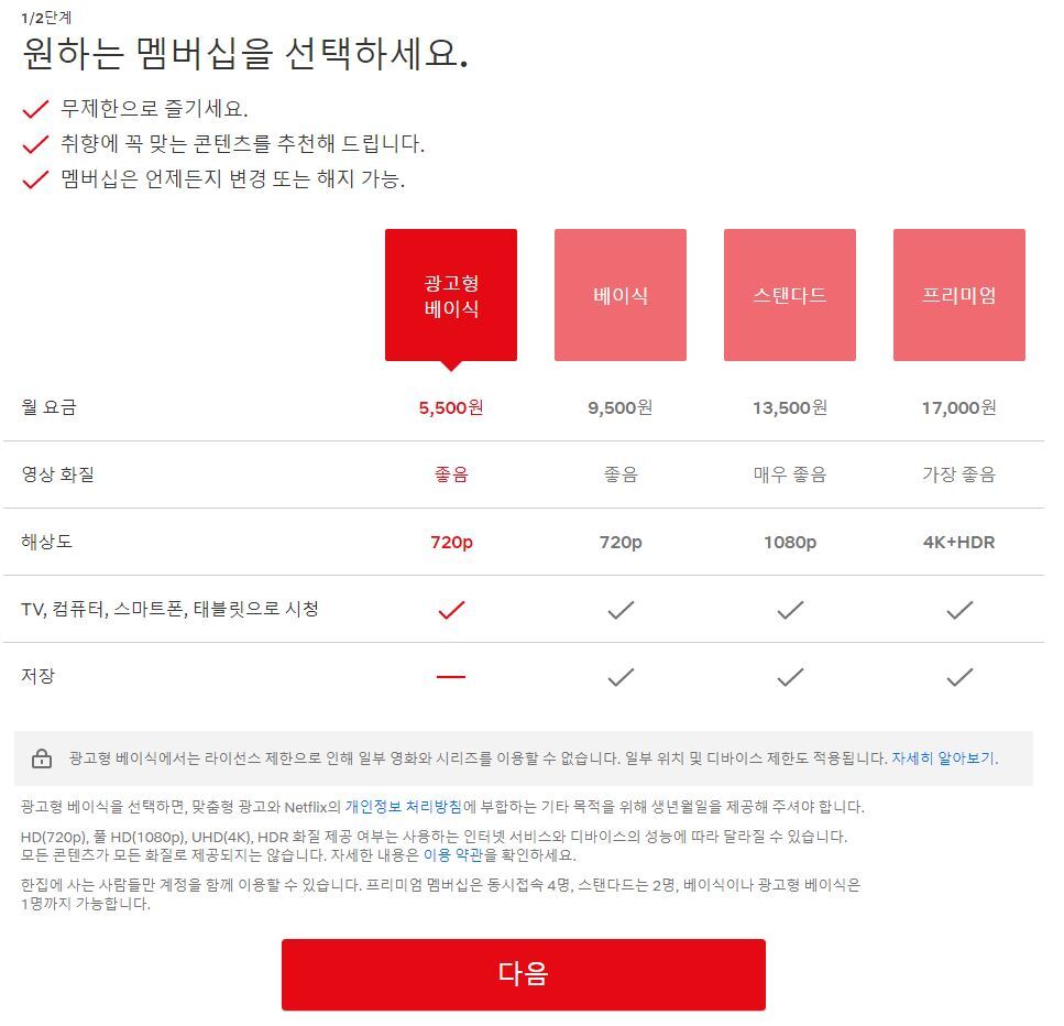기존 넷플릭스 요금제는 베이식 9,500원, 스탠다드 13,500원, 프리미엄 1,7000원의 세 가지 요금제였습니다. 이번에 광고형 베이식 요금제(월 5,500원)가 새로 추가된 것입니다. 그래서 현재 선택할 수 있는 넷플릭스 요금제는 총 4가지입니다.