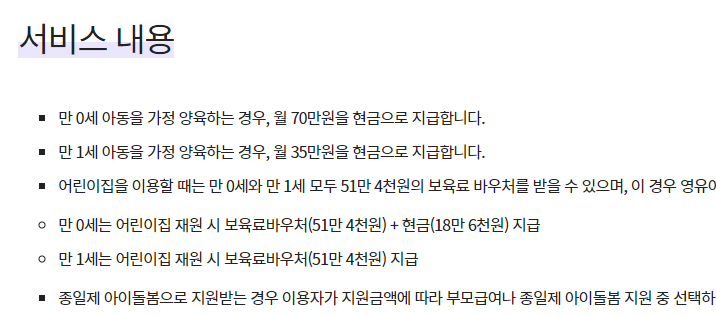 2023년부터 도입되는 복지정책으로 만 0세 아동이 있는 경우, 매월 70만원, 만 1세 아동이 있는 경우 매월 35만원을 지급합니다. 어린이집을 이용하는 경우에는 보육료 바우처로 지급됩니다. 단, 부모급여 지원금액이 보육료 바우처 금액보다 큰 경우 현금 차액 지급합니다.