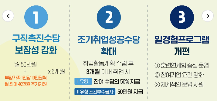 | I 유형 : 성공수당을 잔여 구직촉진수당의 50%만큼 지급 II 유형 조건부 수급자 : 조기취업성공수당 50만원 지급 |