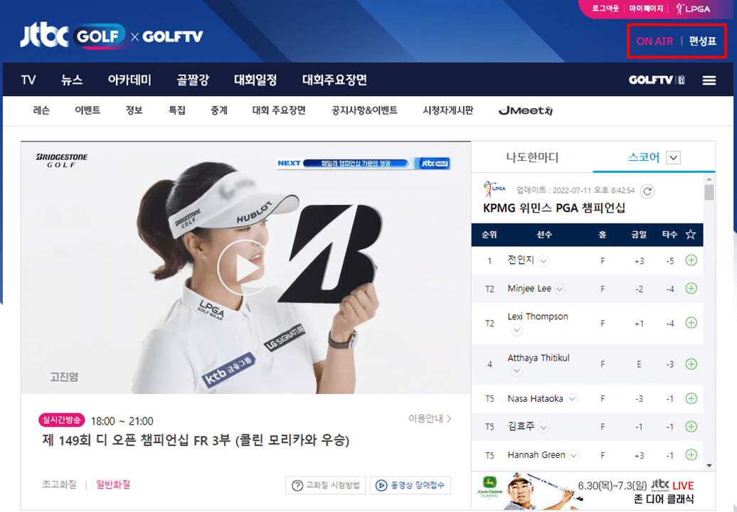 우측 상단의 '편성표' 메뉴를 클릭하시면 골프 방송 중계표를 확인하실 수 있으며, 재방송을 보실 경우 방송시간을 확인하시고 온에어를 통해 접속하시면 무료로 시청하실 수 있습니다.