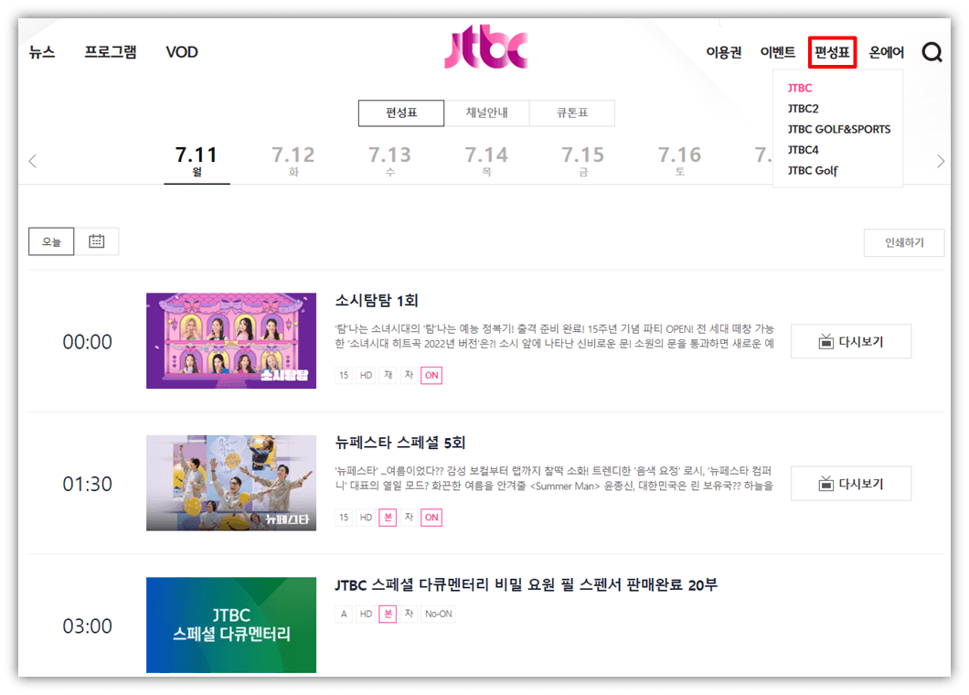 JTBC 홈페이지에 접속하면 실시간 온에어 방송을 무료로 시청할 수 있습니다. 그리고 날짜별 방송 편성표도 확인할 수 있고, 뉴스 기사를 보거나 VOD 재방송 다시보기도 무료로 감상할 수 있습니다.