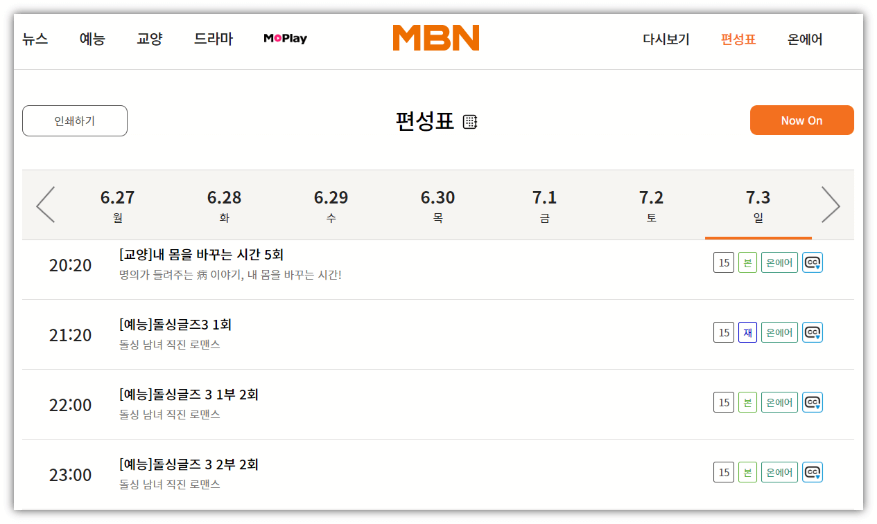 MBN 홈페이지에서는 방송 편성표도 확인이 가능합니다. '온에어' 메뉴 왼쪽에 있는 '편성표' 메뉴를 클릭하시면 날짜에 따른 방송 프로그램과 시간을 확인하실 수 있습니다. 재방송을 보고 싶은 경우에도 편성표를 확인하신 후, 재방송 날짜 및 시간에 맞추어 MBN '온에어' 메뉴를 통해 무료로 시청하실 수 있습니다.