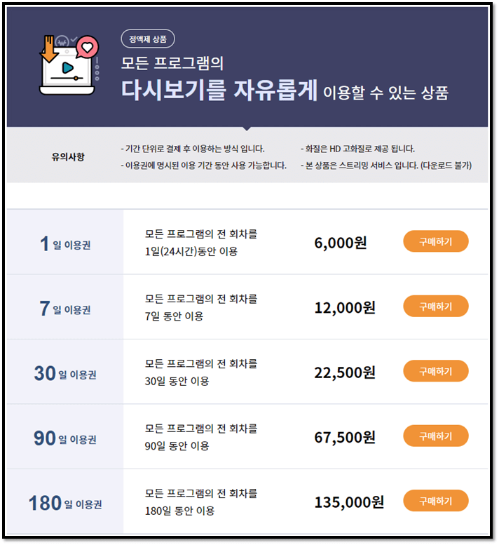 다시보기 서비스를 이용하기 위해서는 유료 이용권을 구매해야 합니다. 위와 같이 기간 단위로 결제 후 이용할 수 있도록 되어 있는데, 구입하시면 고화질로 모든 프로그램을 선택해서 보실 수 있습니다.