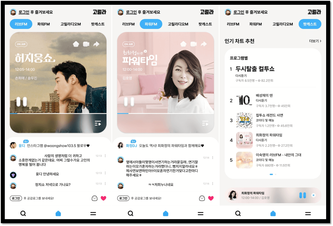SBS 라디오 앱 고릴라를 설치하시면 바로 실시간 라디오 청취가 가능합니다. 파워FM, 러브FM, 고릴라디오M, 팟캐스트 모두 무료로 들을 수 있고, 방송을 진행하는 DJ와 메시지를 보내면서 소통도 하실 수 있습니다.