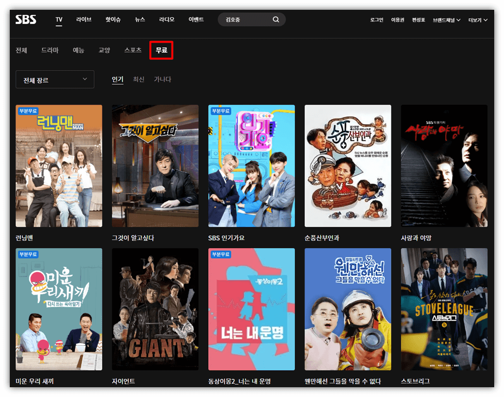 상단의 'TV' 메뉴를 선택하신 후, 아래 '무료'를 선택하시면 다양한 TV 프로그램을 무료로 재방송 다시보기를 할 수 있습니다. '순풍산부인과'나 '그것이 알고싶다' 등 과거 방영된 프로그램도 완전 무료로 시청 가능하고, '런닝맨'이나 '미운 우리 새끼' 또는 'SBS 인기가요' 등의 TV 프로그램은 특정 회차까지는 부분 무료로 감상할 수 있다고 하니 여기에서 다양한 예능, 드라마 등의 재방송 다시보기를 무료로 감상해 보시기 바랍니다.