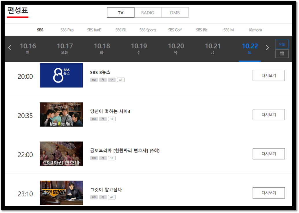 SBS 공중파 채널 또는 케이블 채널을 선택한 후, 날짜를 선택하면 편성 시간표를 자세히 확인할 수 있습니다.