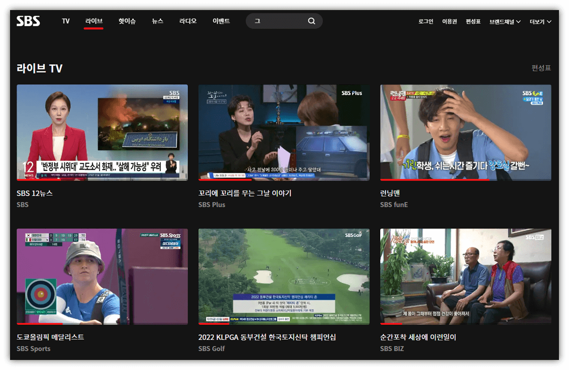 상단의 '라이브' 메뉴를 선택하시면 위 화면과 같이 SBS 채널부터 시작해 SBS Plus, SBS funE, SBS Sports, SBS Golf, SBS BIZ 등의 채널까지 무료로 시청할 수 있습니다.