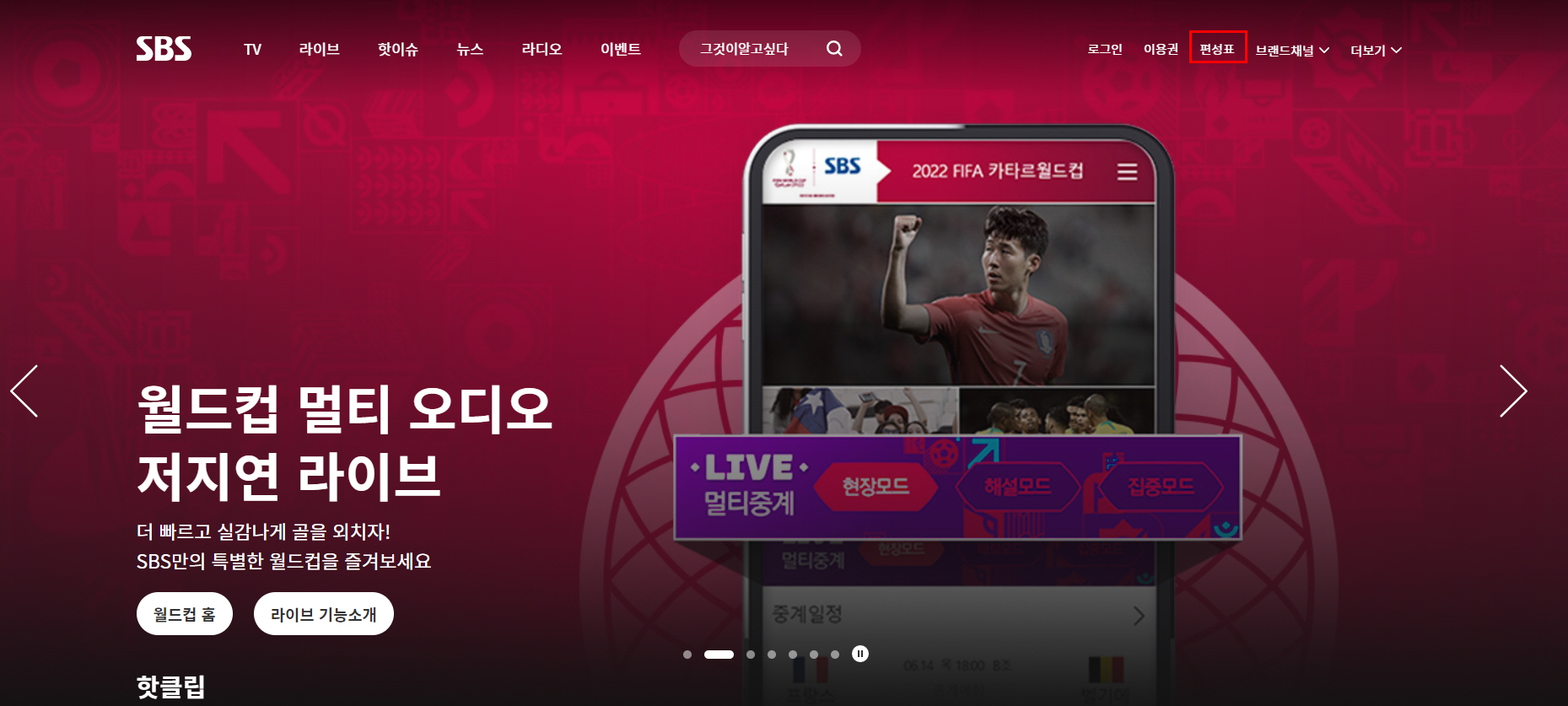 우측 상단의 '편성표' 메뉴를 선택하면 어떤 프로그램이 몇 시에 본방송 또는 재방송되는지 편성 시간표를 확인할 수 있습니다.