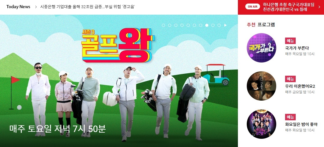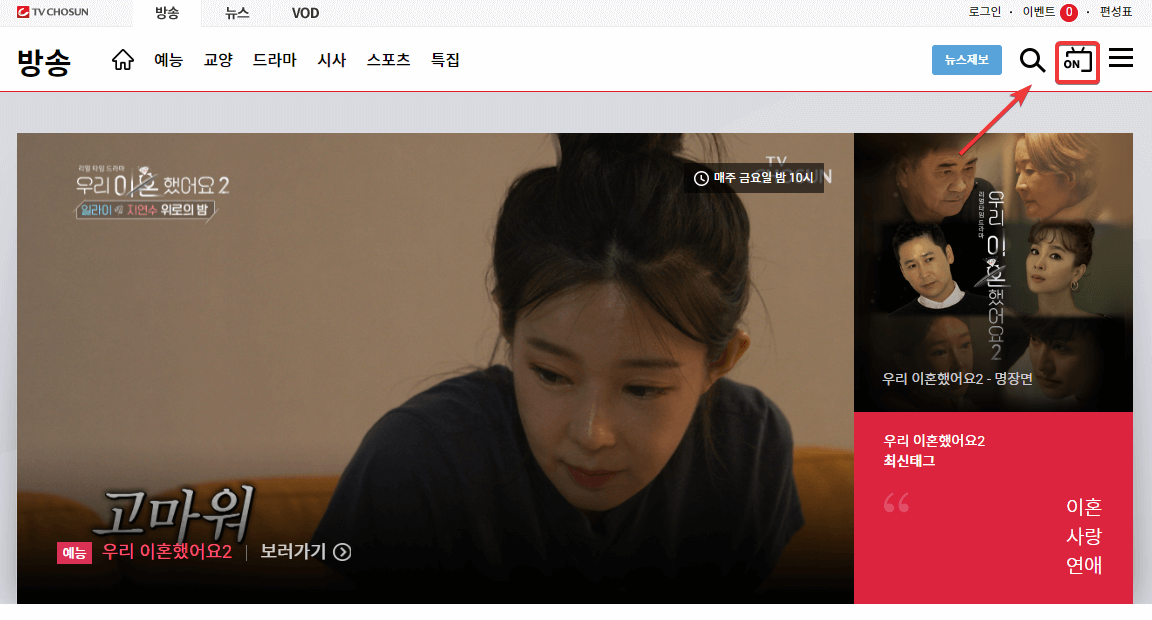 우측 상단의 'on TV' 아이콘 모양을 클릭합니다. 그러면 현재 온에어 방송되고 있는 프로그램을 보실 수 있습니다.