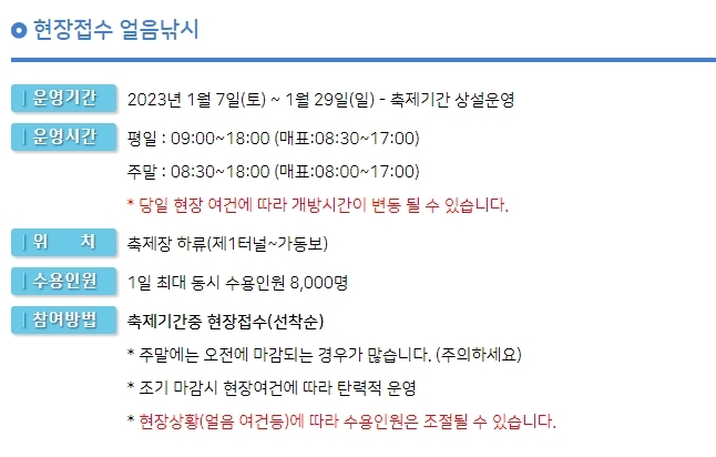 축제기간 : 2023년 1월 7일 ~ 1월 29일 (23일 동안) / 선등거리 2022년 12월 24일 ~ 2023년 2월 5일