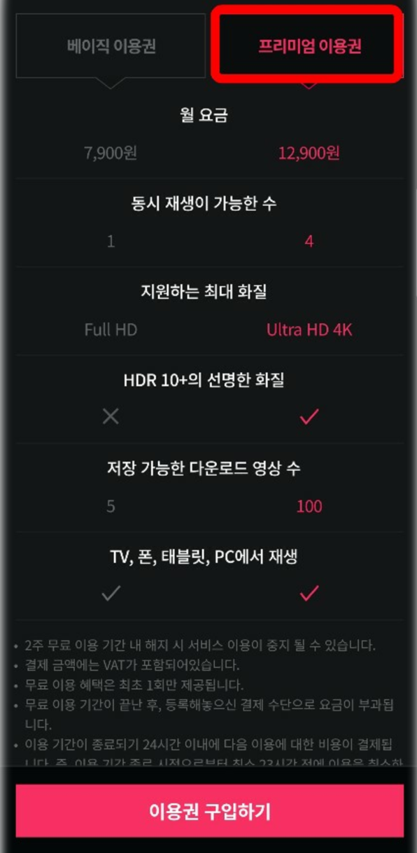 프리미엄 이용권은 가족이 이용을 하면 괜찮을 것 같습니다. 그리고 혼자 이용할 경우에는 베이직을 선택하시면 됩니다.