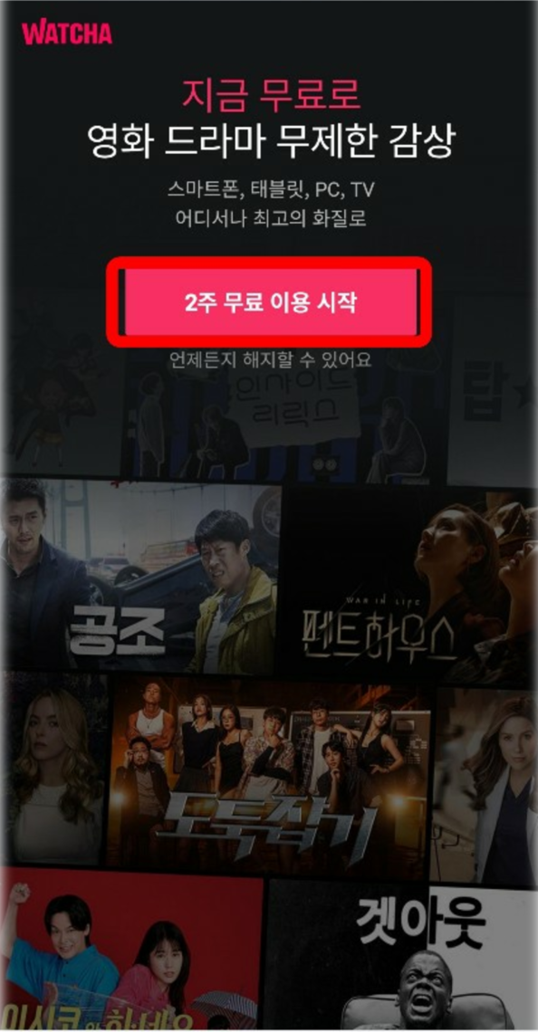 왓챠 공식 홈페이지 또는 앱에 접속하시면 위와 같은 화면을 보실 수 있습니다. '2주 무료 이용 시작' 버튼을 클릭하여 가입을 시작하시면 됩니다. 언제든지 해지할 수가 있어 부담 없이 가입하실 수 있으며, 스마트폰과 태블릿, PC 및 TV 어느 매체에서나 최고의 화질로 시청을 할 수가 있습니다.