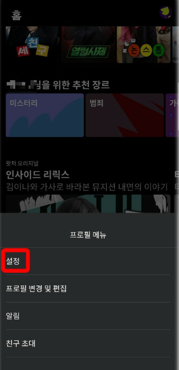 2. 그러면 프로필 메뉴 창이 뜨는데, '설정'을 선택합니다.