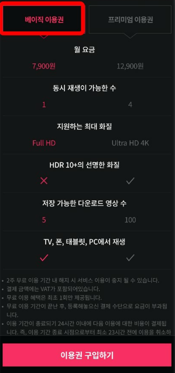 베이직 이용권은 월 요금이 7,900원으로 프리미엄보다 가격이 저렴한 장점이 있습니다. 하지만 동시 재생을 할 수가 없으며, 지원하는 화질도 프리미엄보다 떨어지는 Full HD를 지원합니다. HDR 10+의 기능도 제외됩니다. 저장 가능한 다운로드 영상 수도 5개 밖에 되지 않지만 그럼에도 불구하고 스마트폰에서만 시청할 경우 가격이 저렴하기에 혼자 사용을 할 경우에는 베이직 이용권을 추천드립니다.