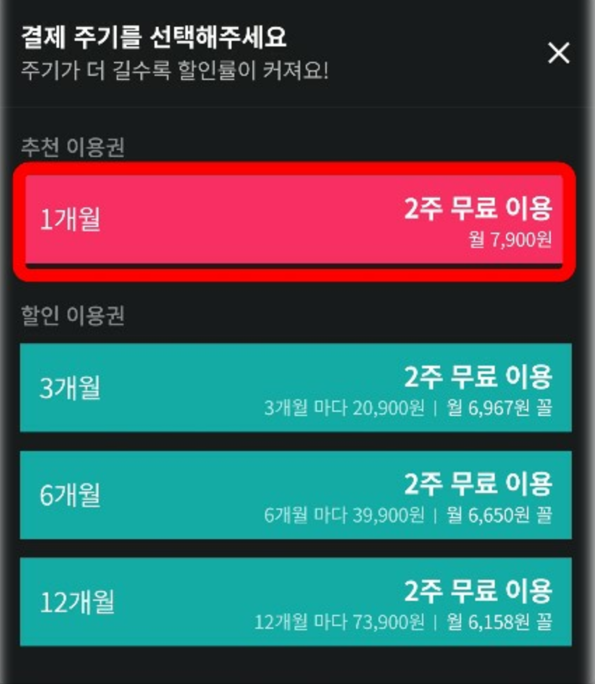 결제 주기는 주기가 길수록 할인율이 커지는 경향이 있습니다. 하지만 처음 이용을 할 경우에는 일단 사용을 해보고 만족스러우면 기간을 연장하는 것을 추천드립니다. 무료로 체험만 하실 경우에는 2주가 지나기 전에 반드시 왓챠 해지를 해주셔야 합니다.