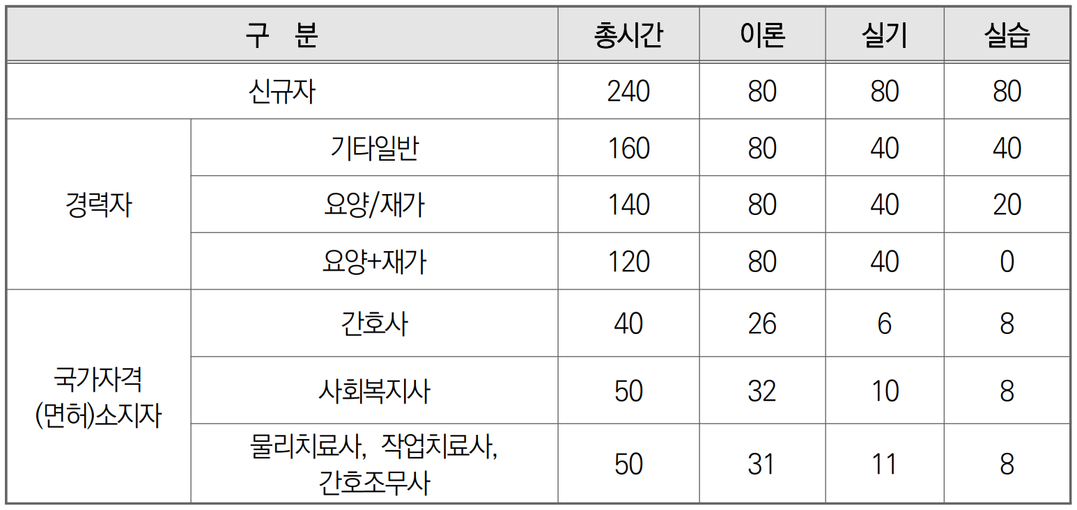 ※ 국가 자격증 소지자 중 사회복지사, 간호조무사, 물리치료사는 50시간이며, 간호사는 40시간 교육 과정을 이수 후 요양보호사 자격 시험에 응시하시면 됩니다.