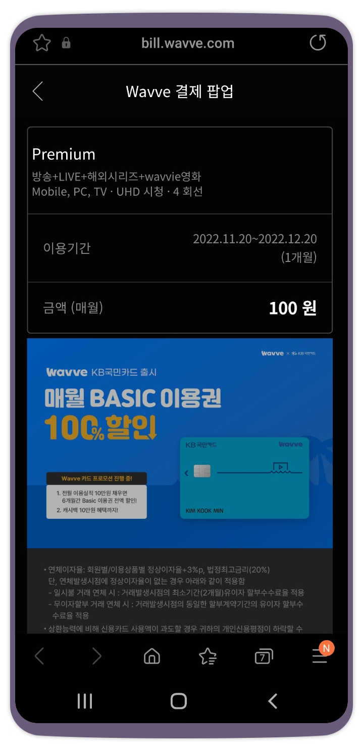 요금제를 선택하신 후에는 팝업 화면이 나오게 되는데 결제수단을 선택하시고, 약관에 동의하신 후 다음을 눌러주시면 됩니다.