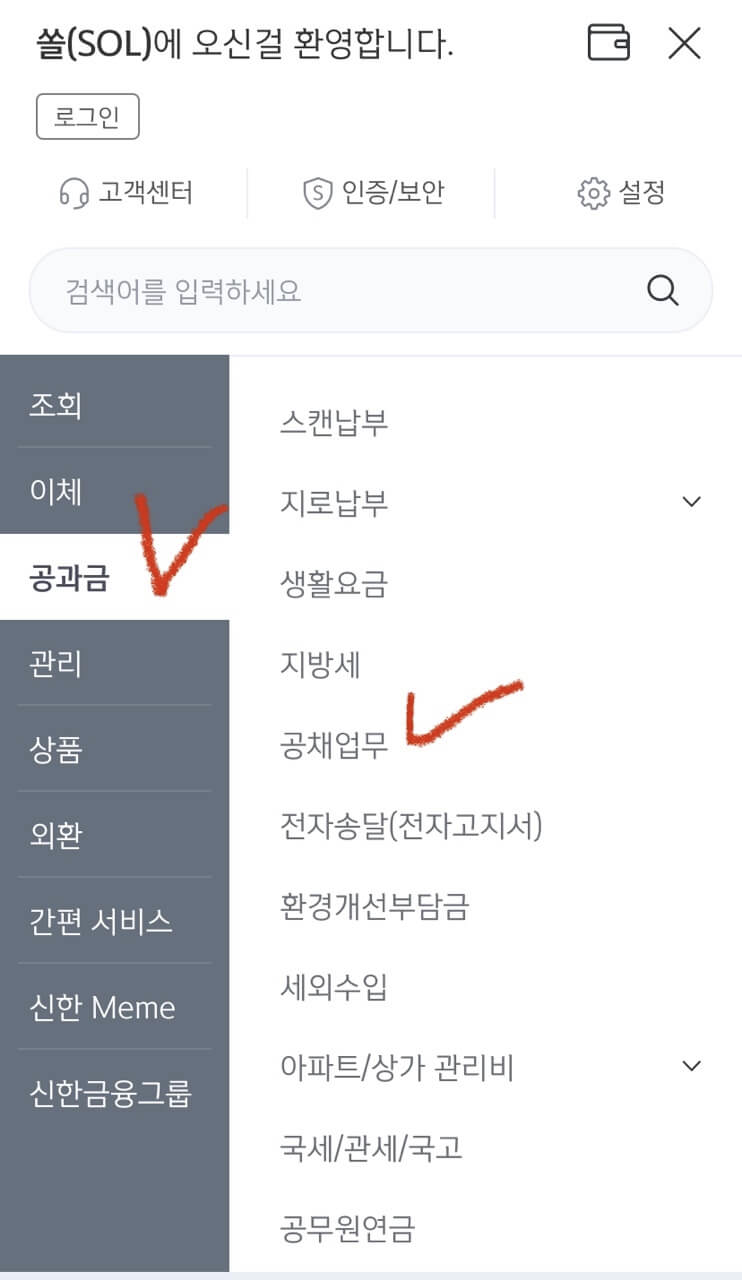 2) 우측 상단 메뉴 클릭 > '공과금' 클릭 > '만기경과채권상환' 클릭하여 환급금을 조회